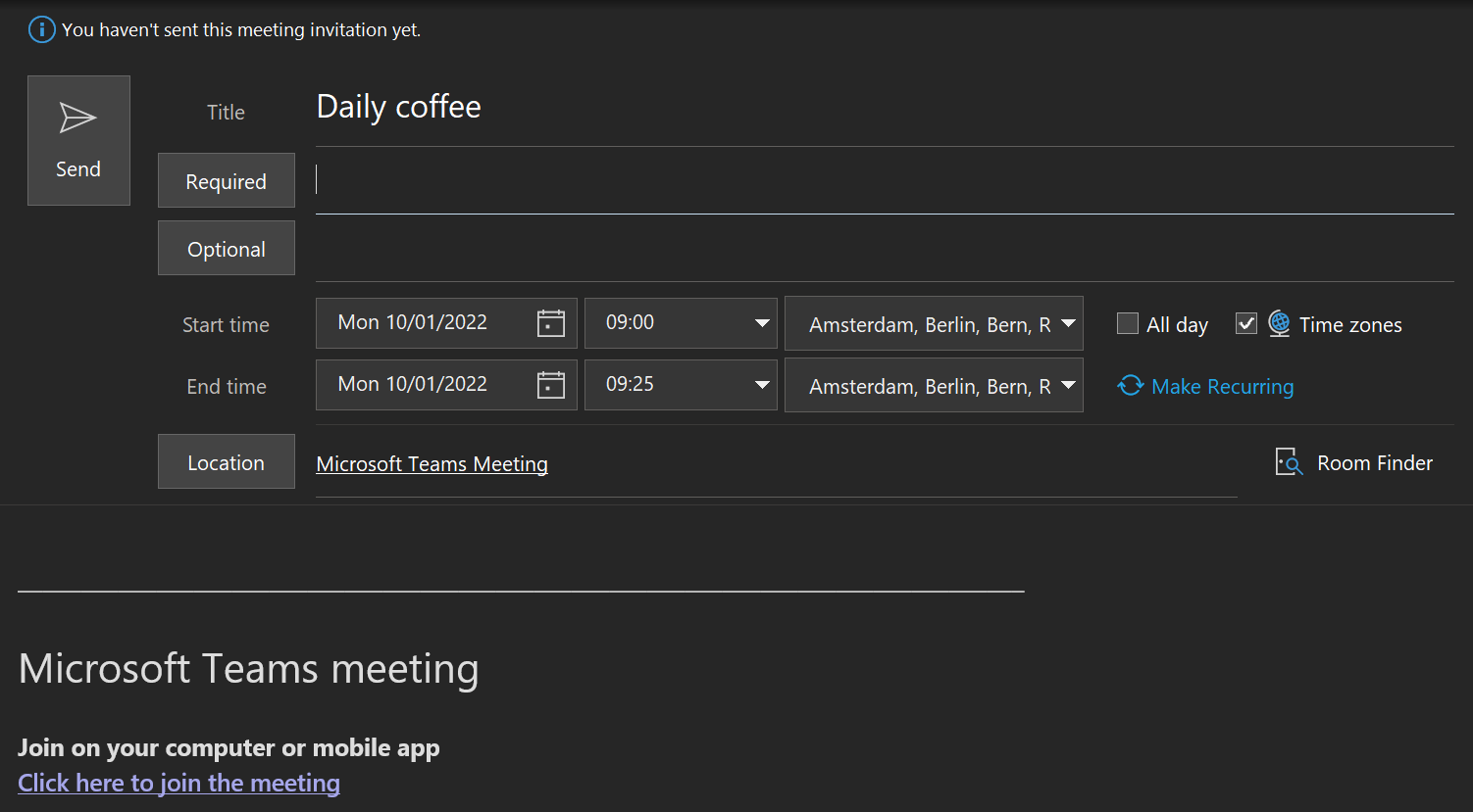Ideal when having a lot of online meetings each day. For every item you create in your agenda a Microsoft Teams meeting is created automatically. No need for manually hitting that ‘Teams Meeting’ button anymore!