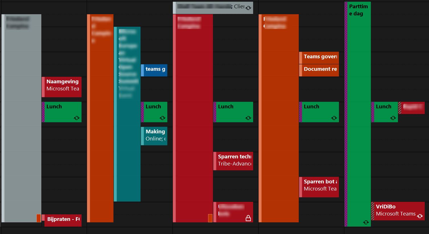 When adding a category with a color to each your calendar item you will instantly get a better understanding of how your week will look like. This helps me to save time for keeping control over my own agenda and spot gaps rather quickly.