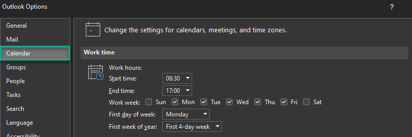 There you’ll find the ‘Outlook options’ popup with the ‘Calendar’ section. (except the ‘1. Categorize your calendar items’ setting)